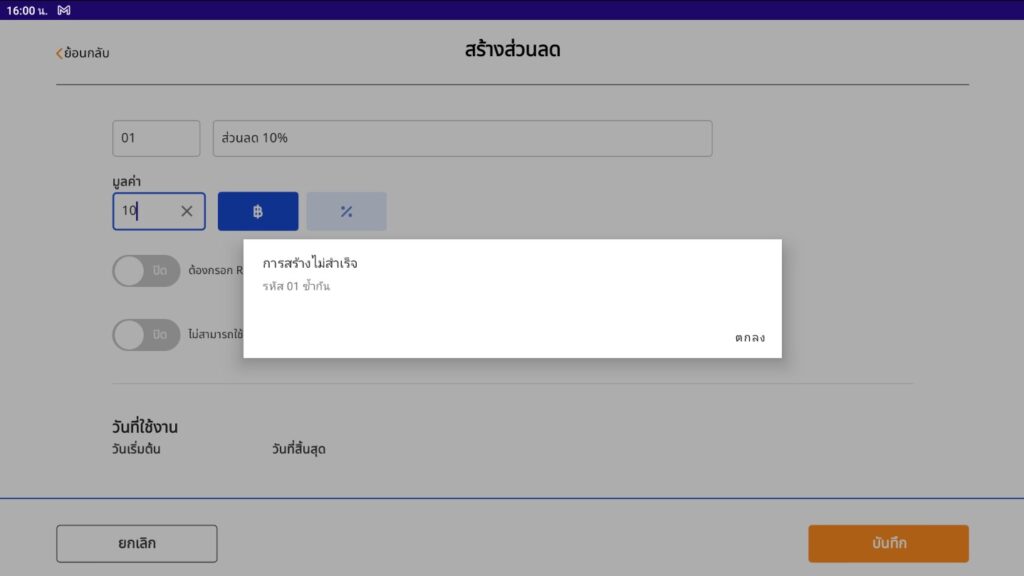 1. ระบบแสดงแจ้งเตือนว่า การสร้างไม่สำเร็จ เนื่องจากผู้ใช้งานกรอกรหัสคูปองส่วนลดที่สร้างใหม่ซ้ำกับรหัสคูปองที่มีอยู่ในระบบ