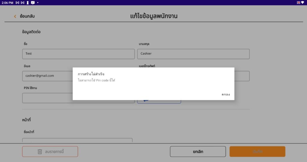 ระบบแสดงแจ้งเตือนว่า การสร้างไม่สำเร็จ เนื่องจากหากมีการแก้ไขข้อมูลพนักงาน เมื่อแก้ไขเสร็จแล้ว ผู้ใช้งานจะต้องรีเซ็ทรหัสพินให้พนักงานทุกครั้ง หากไม่รีเซ็ทรหัสพินจะไม่สามารถแก้ไขข้อมูลพนักงานได้