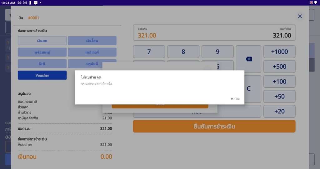 ระบบแจ้งเตือนว่า ไม่พบส่วนลด เนื่องจาก ผู้ใช้งานกรอกเลขคูปองบัตรกำนัลที่ไม่มีอยู่ในระบบ
