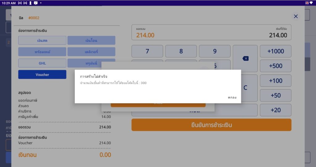 ระบบแจ้งเตือนว่า การสร้างไม่สำเร็จ เนื่องจาก รหัสคูปองที่ผู้ใช้งานกรอกไม่เข้าเงื่อนไขการใช้คูปองบัตรกำนัล